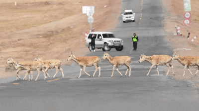 而在青藏公路這頭,可可西里管理處安排工作人員采取短暫交通管制、禁止鳴笛、巡護(hù)救助等措施,為藏羚羊遷徙產(chǎn)仔保駕護(hù)航。伴隨遷徙高峰期的到來,藏羚羊“過公路”已經(jīng)成為青藏公路沿線的一道獨特風(fēng)景。