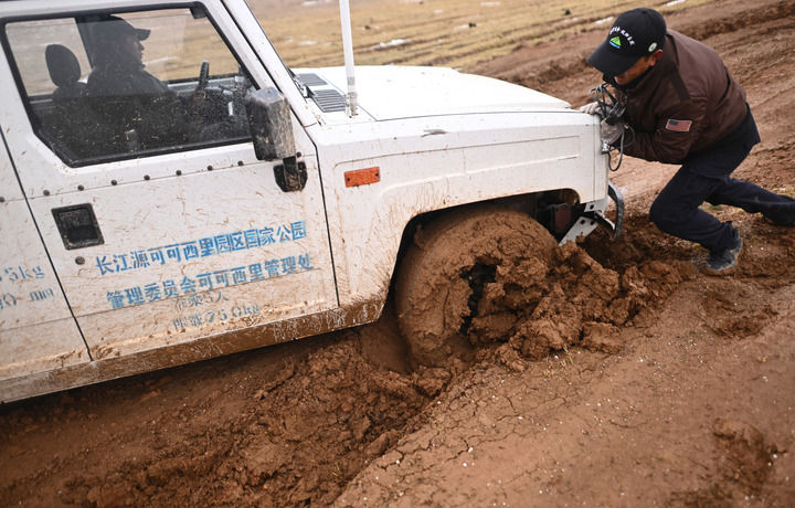 正值夏天,可可西里原本的凍土和沼澤融化成一個(gè)個(gè)爛泥灘。絞盤斷了、千斤頂壞了,巡山車輛埋在泥里,動(dòng)彈不得。