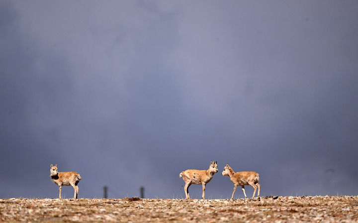 三只藏羚羊在三江源地區(qū)活動(dòng)(5月28日攝)。新華社記者 張宏祥 攝