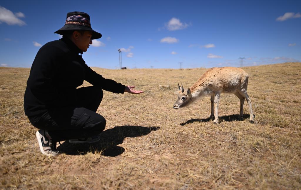 在可可西里國家級(jí)自然保護(hù)區(qū)索南達(dá)杰保護(hù)站,巡山隊(duì)員扎西桑周在野生動(dòng)物救助中心內(nèi)與一只被救助的小藏羚羊互動(dòng)(5月30日攝)。新華社記者 張宏祥 攝