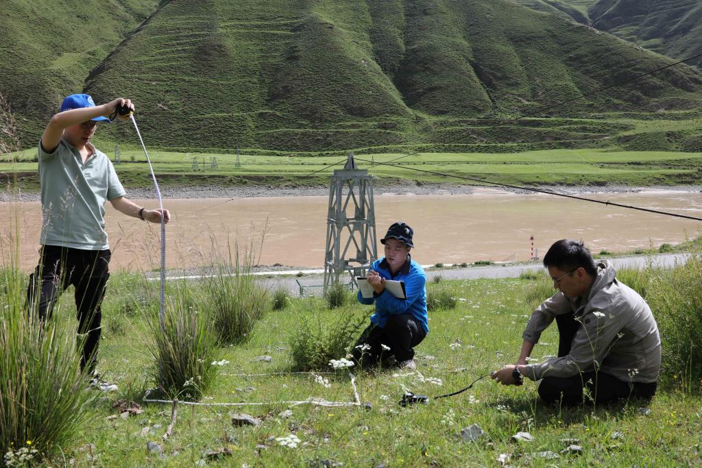7月22日,長(zhǎng)江科學(xué)院水土保持研究所的科考隊(duì)員在通天河直門(mén)達(dá)河段進(jìn)行植被樣方調(diào)查。新華社記者 劉詩(shī)平 攝