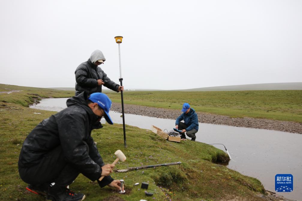 2023年江源綜合科學(xué)考察隊(duì)隊(duì)員在當(dāng)曲濕地進(jìn)行采樣和觀測(cè)(7月24日攝)。新華社記者 劉詩平 攝