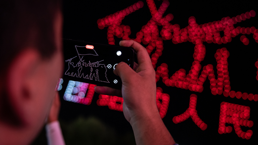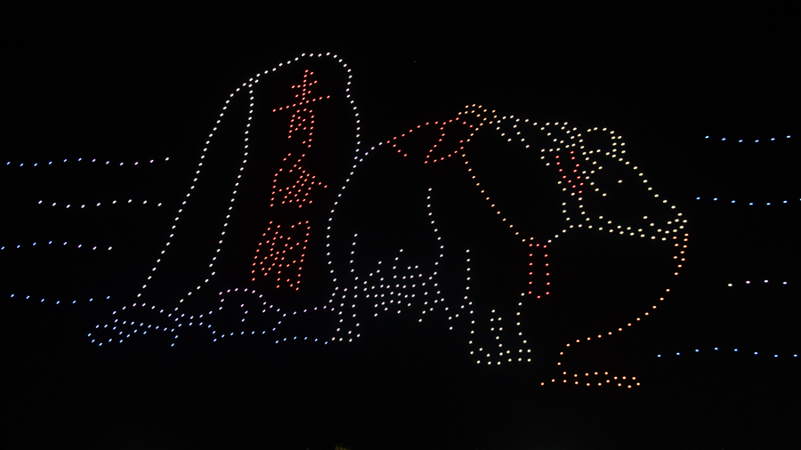 7月31日,慶祝青海省海南藏族自治州成立70周年藏族服飾藝術(shù)嘉年華迎賓晚會現(xiàn)場的無人機編隊表演。