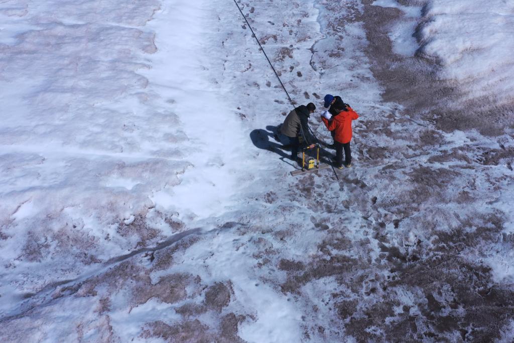 7月27日,范越(左一)和董士琦(左二)在長江源區(qū)的冬克瑪底冰川上使用地質雷達探測冰川厚度(無人機照片)。新華社記者 陳杰 攝