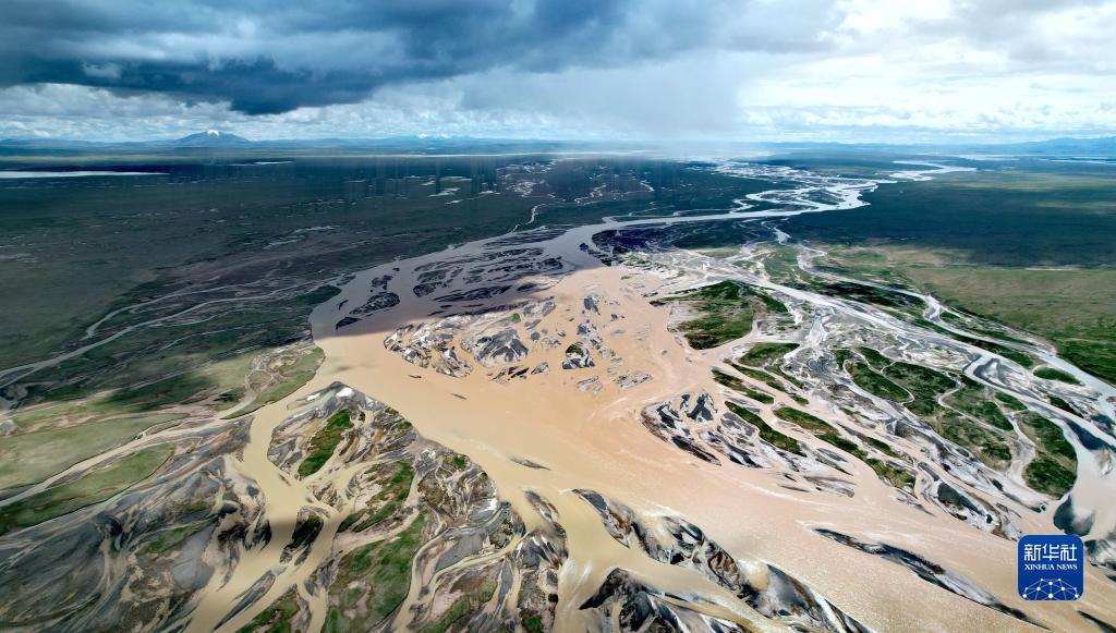 在沱沱河與當(dāng)曲匯合處的囊極巴隴拍攝的辮狀河道局部(7月26日攝,無人機(jī)照片)。新華社記者 劉詩平 攝