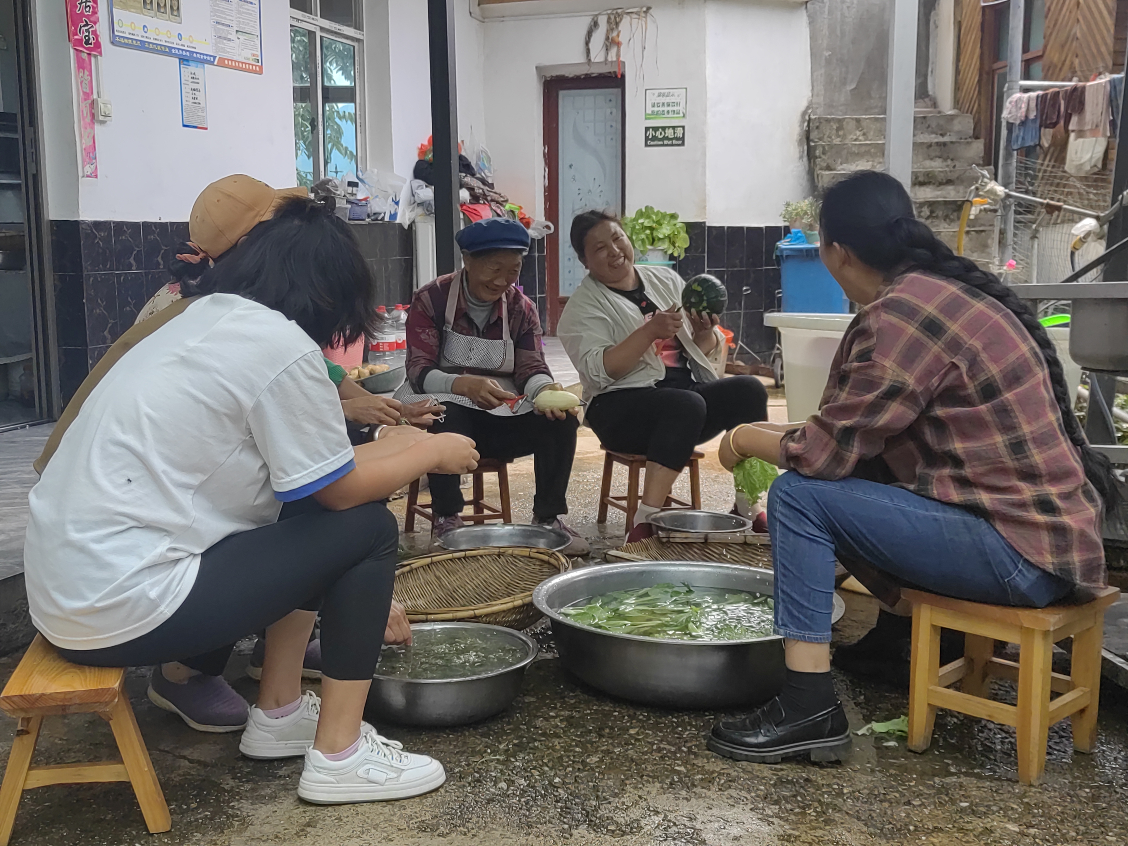 村口,一個(gè)名叫“成姐農(nóng)家樂”的小院里歡聲笑語,熱鬧非凡?!斑@是今天剛挖的洋芋和新鮮采摘的瓜,待會(huì)就給客人做一道當(dāng)?shù)氐奶厣恕瞎涎笥??!薄盁豕瞎涎笥蟮臅r(shí)候,再做個(gè)鍋邊粑粑,這樣的農(nóng)家味道客人肯定喜歡?!痹谵r(nóng)家樂里忙碌的姐妹們邊洗菜邊討論著當(dāng)天的菜品。