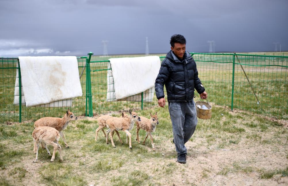 可可西里管理處索南達(dá)杰保護(hù)站隊(duì)員才仁多杰在給被救助的藏羚羊幼仔喂奶(7月28日攝)。新華社記者 張宏祥 攝