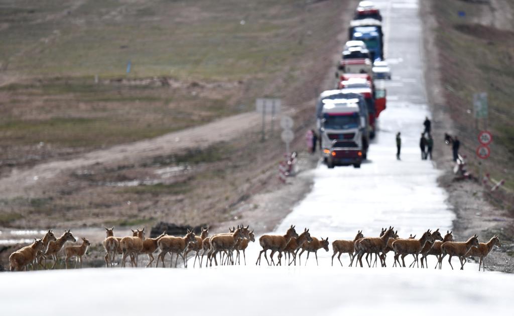 一群待產(chǎn)雌性藏羚羊在通過(guò)青藏公路前往可可西里卓乃湖產(chǎn)仔(5月28日攝)。新華社記者 張宏祥 攝