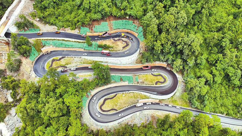 隨著道路基本修復完成,多個路段正進行瀝青路面鋪筑。俯瞰視角中,黑色的旅游公路盤山而上,逶迤山間。據(jù)介紹,海螺溝景區(qū)道路不是簡單重建,而是恢復提升,全線按三級公路標準建設,路基全部拓寬至7.5米,并鋪設瀝青混凝土路面;部分急彎陡坡段進行了改善,提升了觀景臺、護欄的安全等級,行車舒適度大為提升。