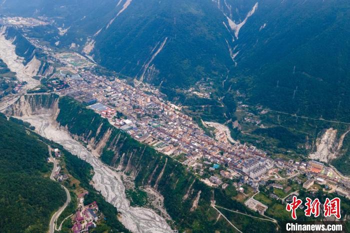 航拍加快災(zāi)后重建的瀘定磨西鎮(zhèn)全景。中新網(wǎng)記者 劉忠俊 攝