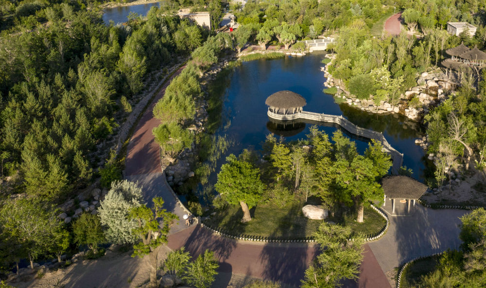 坐落在寧夏銀川市賀蘭山腳下的賀蘭山運(yùn)動(dòng)休閑公園(2021年5月27日攝,無人機(jī)照片)。這里曾是一片砂石采礦塌陷區(qū),當(dāng)?shù)赝ㄟ^植被景觀再造、水系建設(shè)、現(xiàn)代管網(wǎng)鋪建等手段,重新利用廢石、廢坑及各類廢棄建筑材料,把這里變成一座免費(fèi)開放的主題公園。新華社記者 馮開華 攝