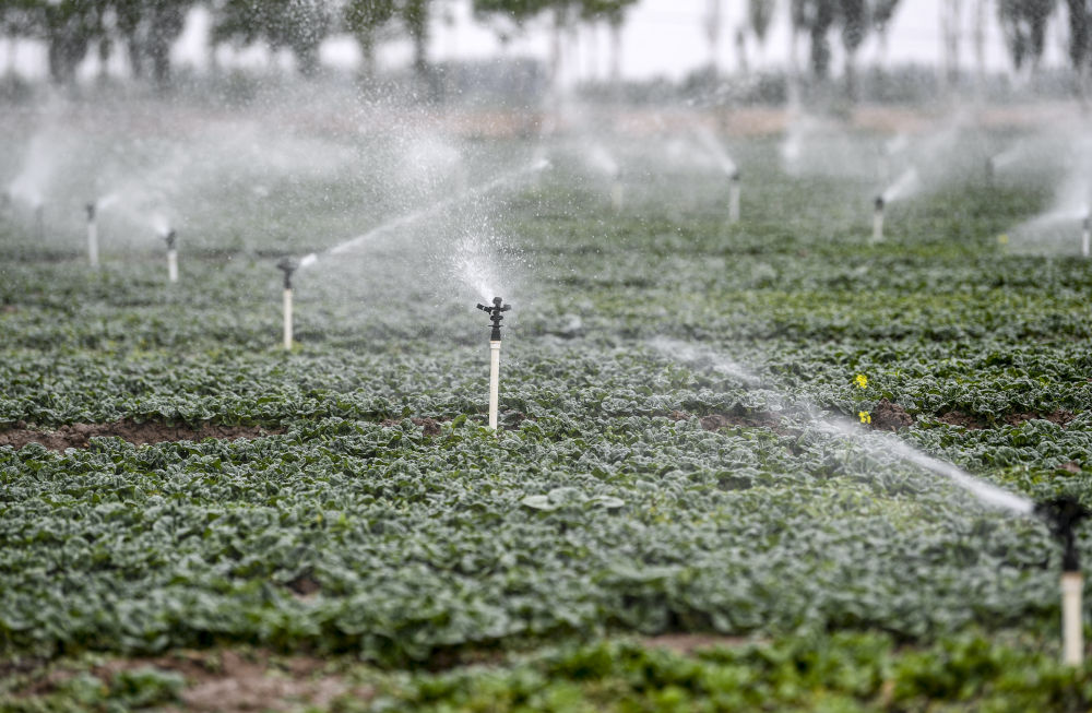 2023年5月25日,在寧夏銀川市永寧縣望洪鎮(zhèn)宋澄村冷涼蔬菜種植基地,小型噴灌節(jié)水設(shè)備在進(jìn)行噴灌作業(yè)。新華社記者 馮開華 攝