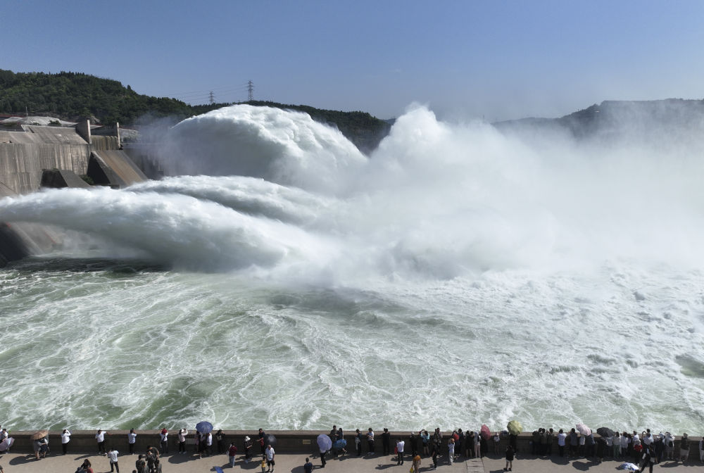 2023年6月23日,游客在黃河小浪底水利樞紐工程出水口觀看調(diào)水調(diào)沙(無人機(jī)照片)。新華社發(fā)(苗秋鬧 攝)