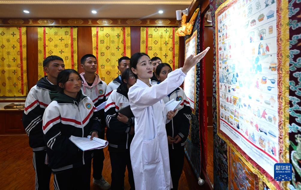 9月8日,在果洛藏族自治州職業(yè)技術(shù)學(xué)校,藏醫(yī)醫(yī)療與藏藥專業(yè)學(xué)生跟隨授課老師觀看藏醫(yī)典籍唐卡。新華社記者 張龍 攝