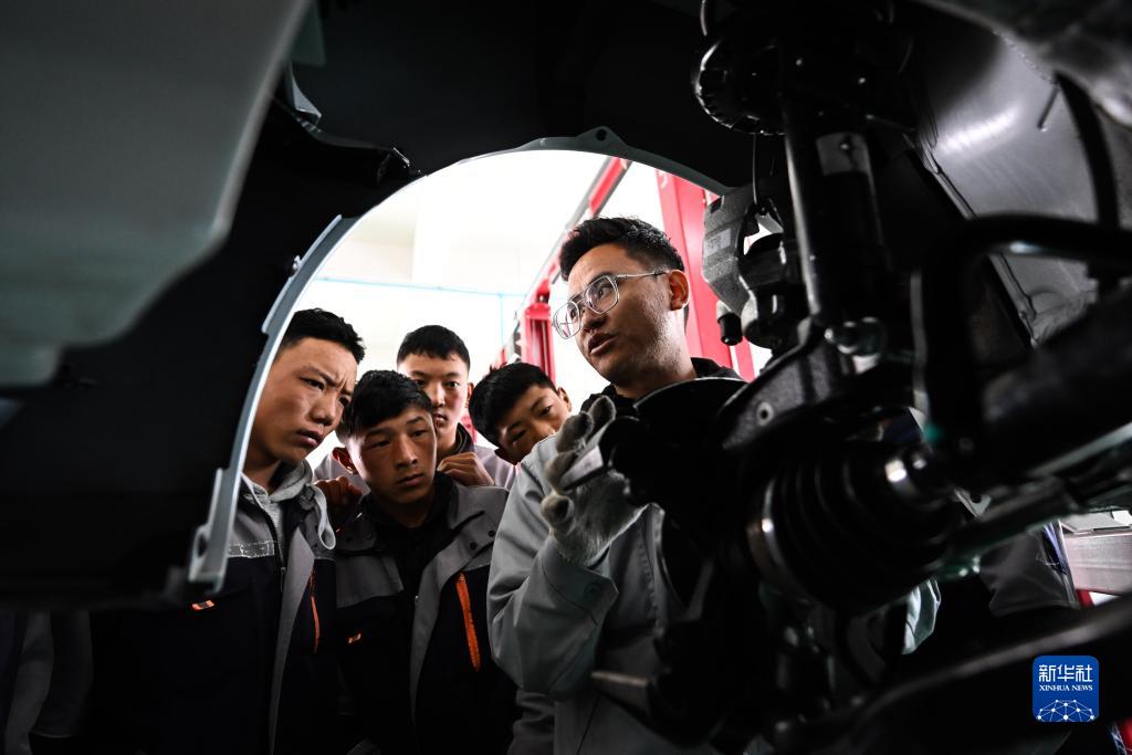 9月8日,在果洛藏族自治州職業(yè)技術(shù)學(xué)校,汽車運用與維修專業(yè)學(xué)生在實訓(xùn)課程上學(xué)習(xí)。新華社記者 張龍 攝
