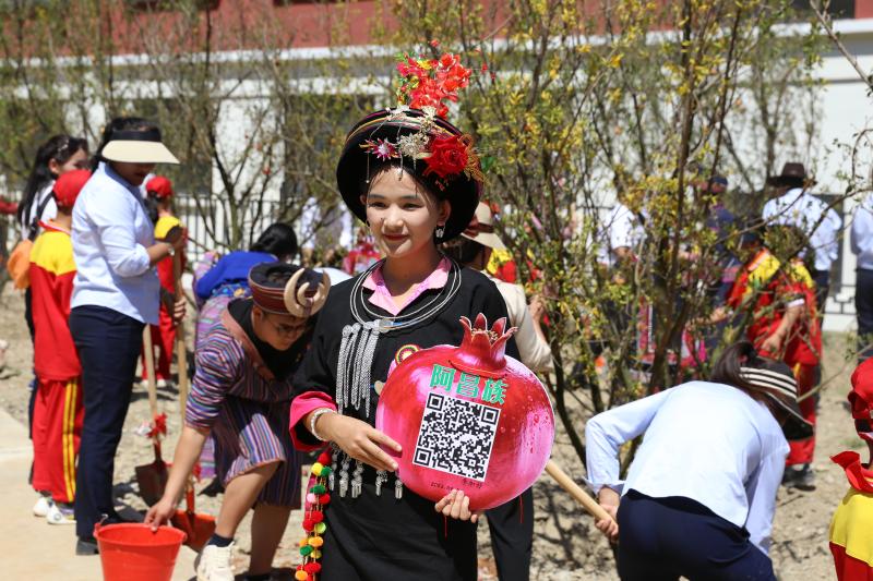 秋陽(yáng)下,56個(gè)民族嘉賓與德欽縣領(lǐng)導(dǎo)干部、老師、學(xué)生互相協(xié)作,培土、澆水,合力種下石榴樹(shù),并在各自種植的石榴樹(shù)上掛上本民族的標(biāo)記牌。“很榮幸能夠與全國(guó)各民族的兄弟姐妹們一起參與到這場(chǎng)加強(qiáng)各民族交往交流交融的盛事中來(lái),這片生機(jī)盎然的石榴林讓我看到了民族團(tuán)結(jié)的強(qiáng)大力量,我們各民族一定會(huì)像石榴籽一樣緊緊抱在一起,共同奔向更美好的生活?!眮?lái)自新疆的烏孜別克族嘉賓江阿古麗·木哈買(mǎi)提加爾激動(dòng)地說(shuō)。