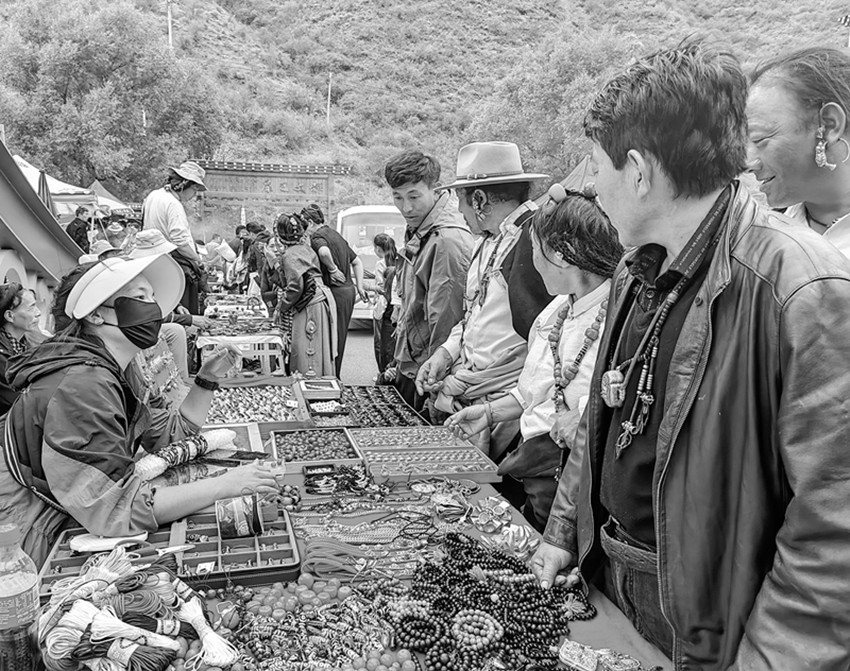 輾轉(zhuǎn)在各大展位,商品形態(tài)、構(gòu)造原理、蘊含寓意等,商家們都會一一介紹。這些商家有來自德格縣的,也有白玉、甘孜等鄰縣的,90后商家阿白就專程從白玉縣趕了過來。“太喜歡熱情好客的德格了,真是不枉此行?!卑赘嬖V記者,他主要售賣珊瑚、蜜蠟、綠松石等,相較于平日經(jīng)營,參加展會讓他的日收益翻番。