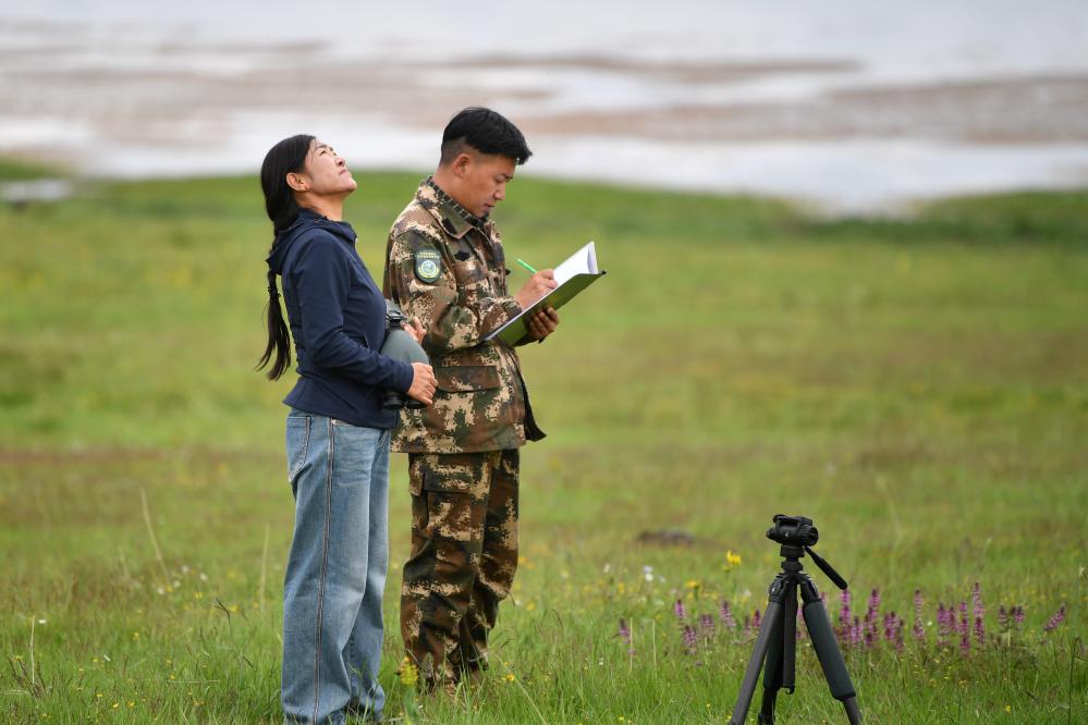 甘肅尕海則岔國(guó)家級(jí)自然保護(hù)區(qū)管護(hù)中心尕海保護(hù)站站長(zhǎng)香毛吉(左)和同事在巡護(hù)過程中做記錄。 新華社記者 方欣 攝