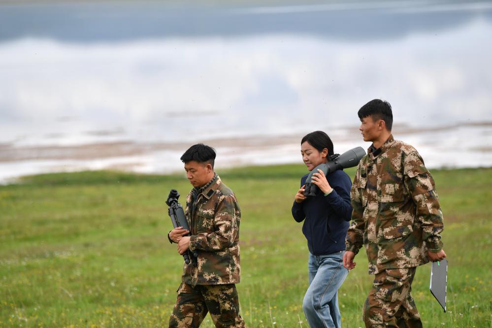 甘肅尕海則岔國(guó)家級(jí)自然保護(hù)區(qū)管護(hù)中心尕海保護(hù)站站長(zhǎng)香毛吉(左二)和同事在保護(hù)區(qū)內(nèi)巡護(hù)。 新華社記者 陳斌 攝