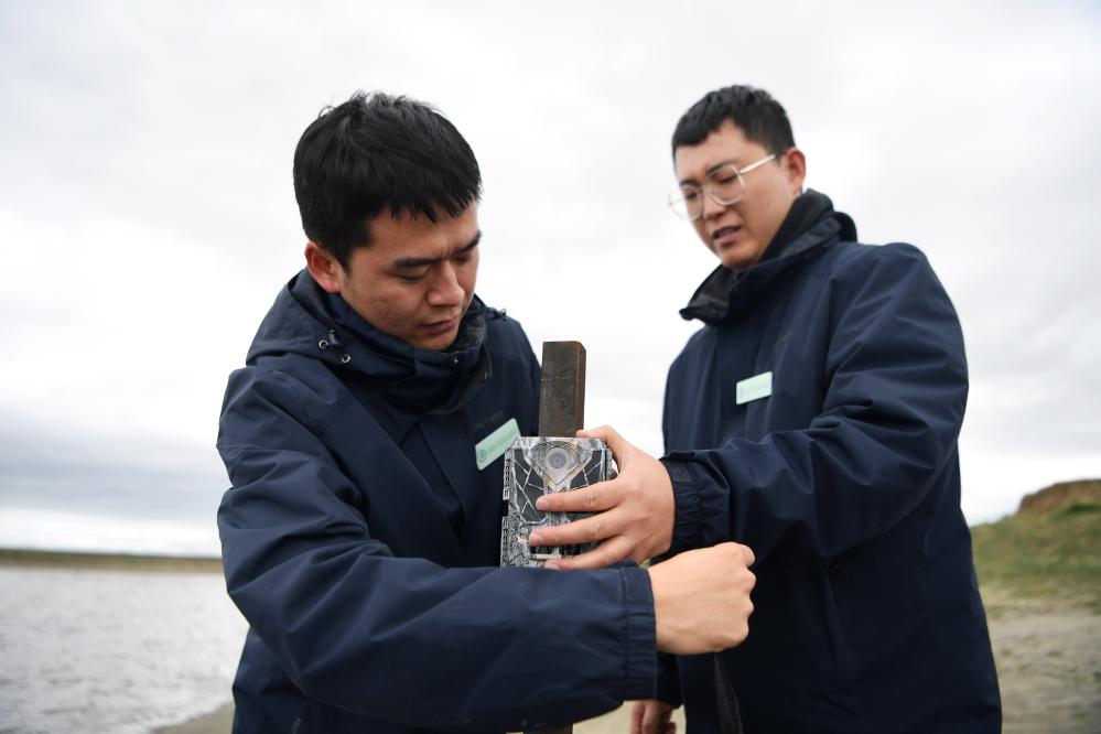 甘肅黃河首曲國(guó)家級(jí)自然保護(hù)區(qū)管護(hù)中心曼日瑪保護(hù)站工作人員王佳陽(右)和同事在保護(hù)區(qū)內(nèi)安放紅外相機(jī)。 新華社記者 張可任 攝
