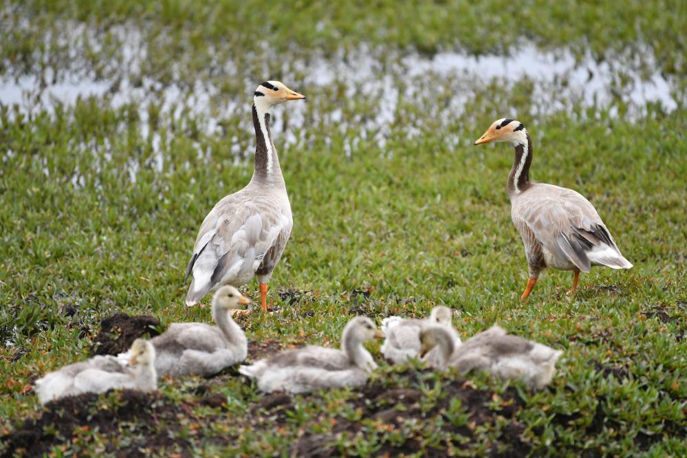 斑頭雁幼鳥在甘肅尕海則岔國(guó)家級(jí)自然保護(hù)區(qū)的尕海濕地嬉戲。 新華社記者 陳斌 攝