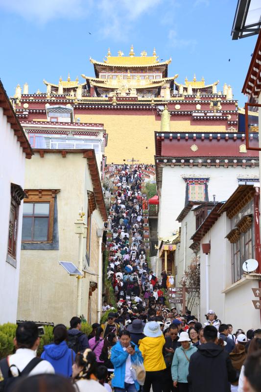 擁有著“小布達(dá)拉宮”和“藏族藝術(shù)博物館”之稱的噶丹·松贊林寺人氣高漲,不少游客身著藏民族服飾欣喜地在景區(qū)寺院的金頂、黃墻下合影留念。景區(qū)外車水馬龍,停車場(chǎng)及公路沿線兩側(cè)停滿了來自全國各地的自駕游車輛,交警及景區(qū)工作人員井然有序的指揮著交通。景區(qū)內(nèi),游客源源不斷,在上車點(diǎn)排起了長隊(duì),工作人員忙碌地指引著游客按秩序檢票上車,“人實(shí)在太多了,假期以來從早上7點(diǎn)至晚上7點(diǎn)半都有游客進(jìn)出,19輛擺渡車都在不停運(yùn)行。”一位景區(qū)工作人員告訴記者。