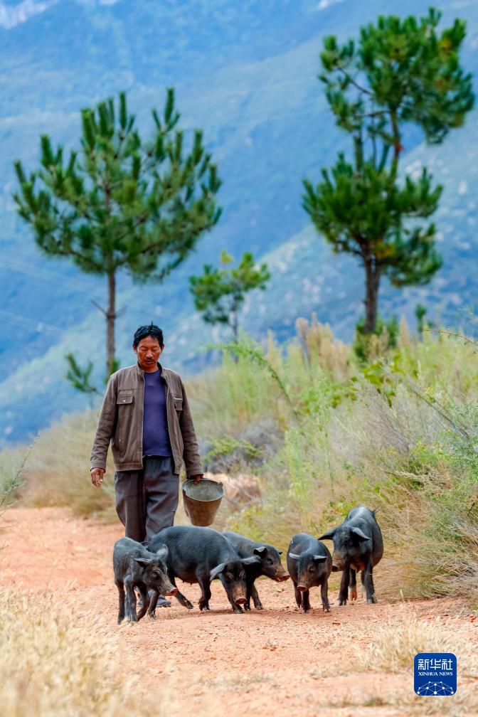 10月13日,在鄉(xiāng)城縣“蘋果+藏豬”種養(yǎng)循環(huán)現(xiàn)代農(nóng)業(yè)園區(qū)內(nèi),當?shù)夭刈迦罕姼窠q翁斗為青德鎮(zhèn)仲德村藏豬養(yǎng)殖專業(yè)合作社放養(yǎng)藏豬。新華社記者 沈伯韓 攝