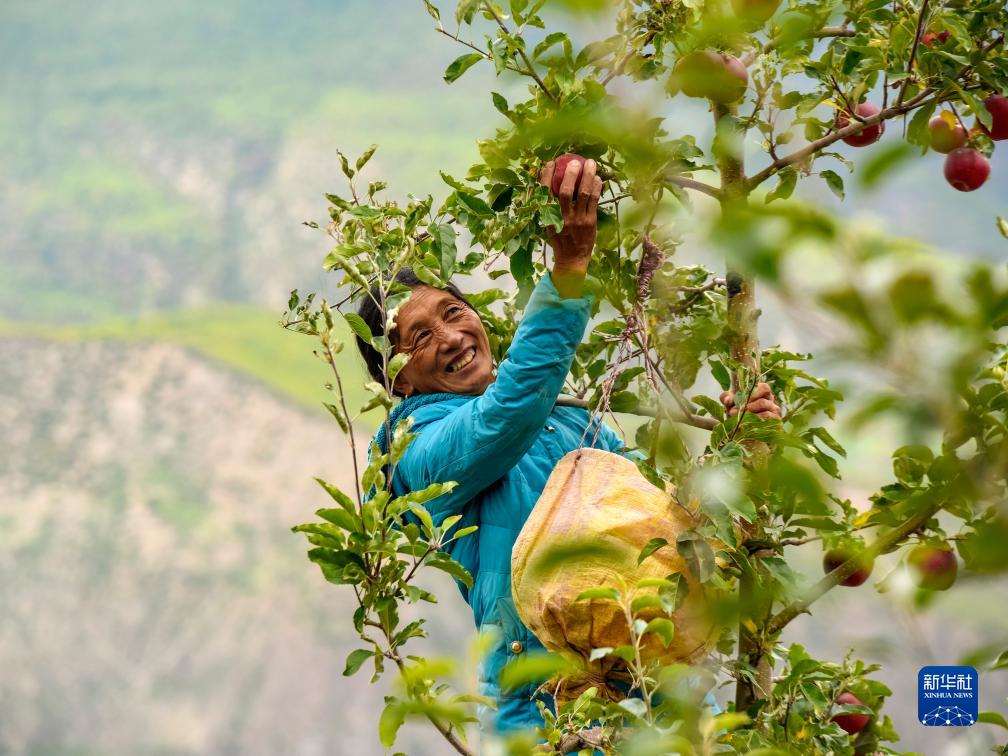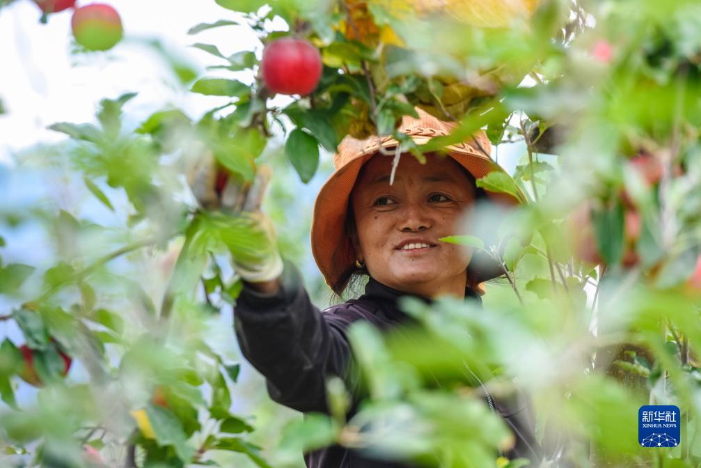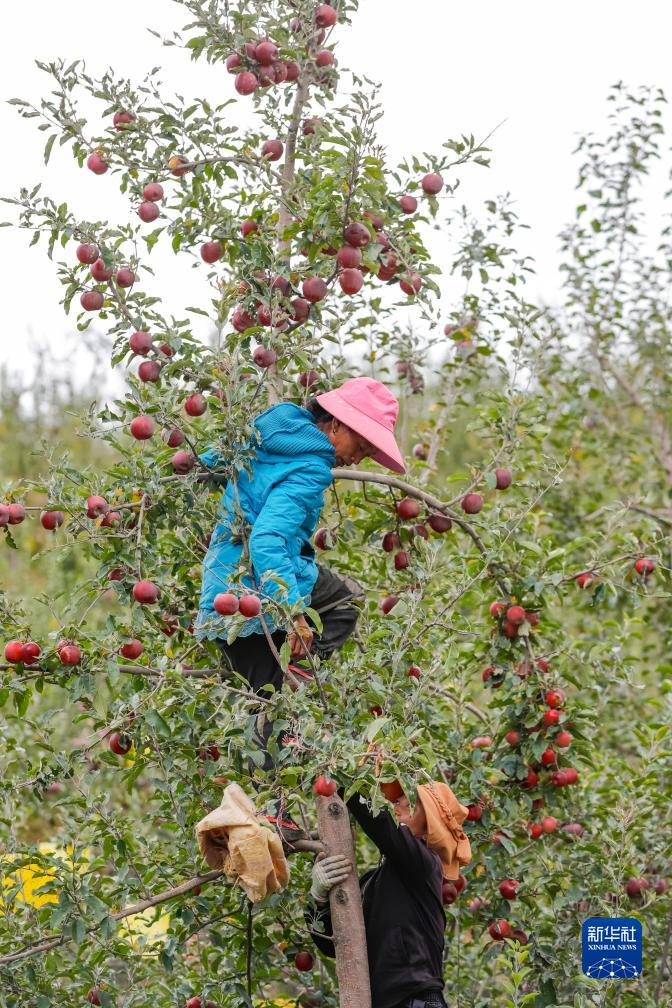 10月13日,在鄉(xiāng)城縣“蘋果+藏豬”種養(yǎng)循環(huán)現(xiàn)代農(nóng)業(yè)園區(qū)內(nèi)的有機蘋果種植示范基地,當?shù)夭刈迦罕姴烧O果。新華社記者 沈伯韓 攝