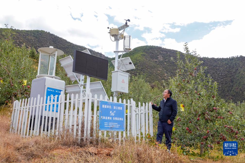 10月13日,在鄉(xiāng)城縣“蘋果+藏豬”種養(yǎng)循環(huán)現(xiàn)代農(nóng)業(yè)園區(qū)內(nèi)的有機蘋果種植示范基地,當?shù)剞r(nóng)牧農(nóng)村和科技局的工作人員檢查氣象監(jiān)測站和蟲情監(jiān)測站的運行情況。新華社記者 沈伯韓 攝