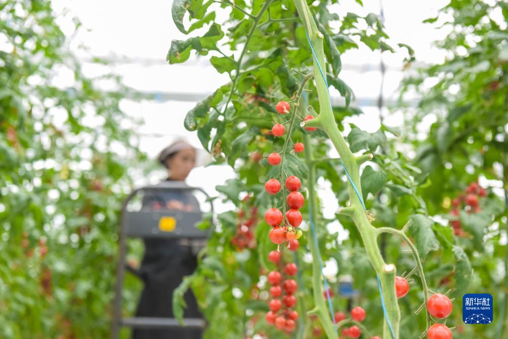 10月13日,在理塘縣瑪吉阿米花園農(nóng)莊的智慧農(nóng)業(yè)無土栽培館,當?shù)夭刈迦罕姴烧t色小番茄。新華社記者 黃曉勇 攝