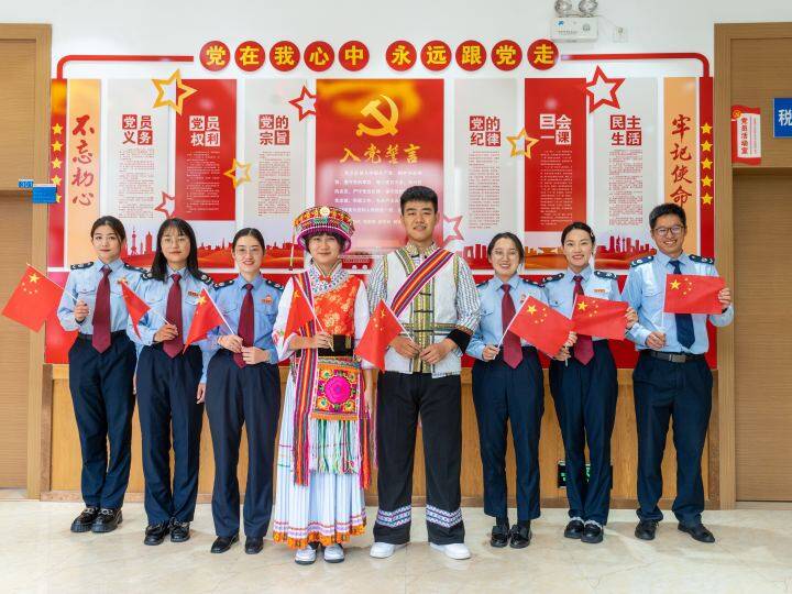 圖為在國家稅務(wù)總局維西傈僳族自治縣稅務(wù)局,傈僳族稅務(wù)干部身著民族服飾與其他稅務(wù)干部歡慶祝中華人民共和國成立74周年