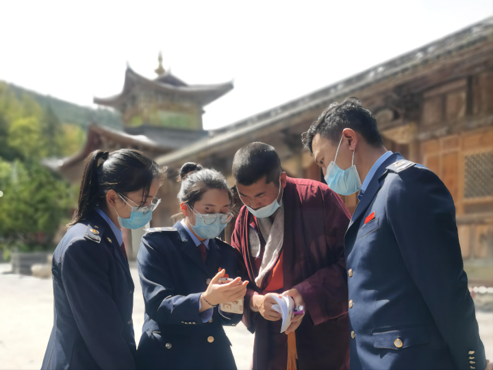 圖為縣稅務(wù)局“傈鄉(xiāng)稅宣小分隊(duì)”上門為壽國寺的藏傳佛教僧眾開展城鄉(xiāng)“兩險(xiǎn)”手機(jī)繳納流程輔導(dǎo)和民族團(tuán)結(jié)進(jìn)步相關(guān)知識(shí)宣傳。