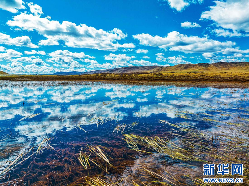 漫澤塘濕地湖水倒映著潔白的云彩。新華網(wǎng) 夏雪東爾 攝