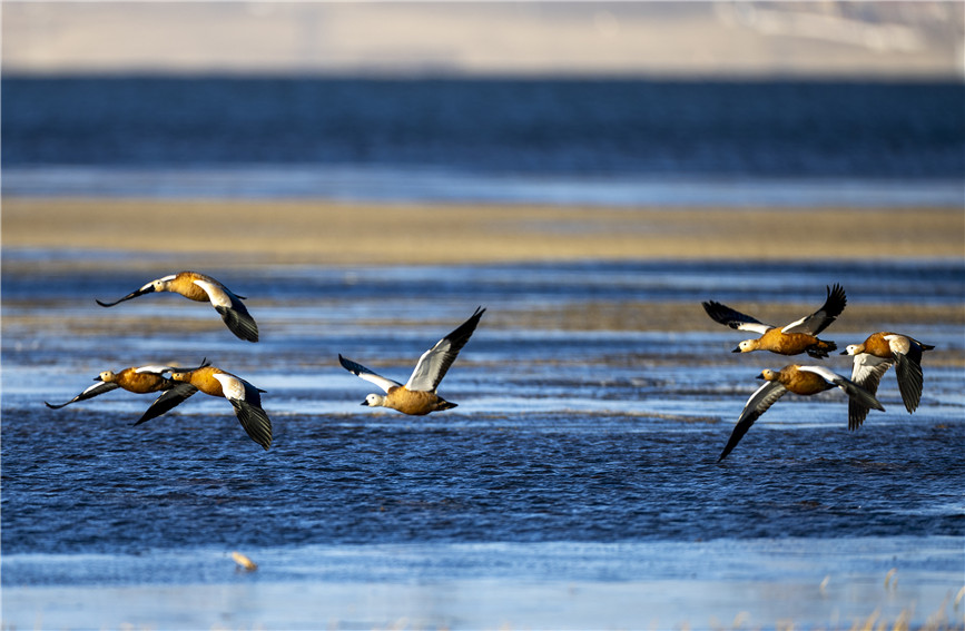 湖面上成群結(jié)隊(duì)的赤麻鴨紛紛翔集,時(shí)而靜臥水面,時(shí)而振翅齊飛、時(shí)而追逐嬉戲、時(shí)而潛水覓食,場面蔚為壯觀,為初冬的青海湖帶來了美麗的色彩和無限生機(jī)。