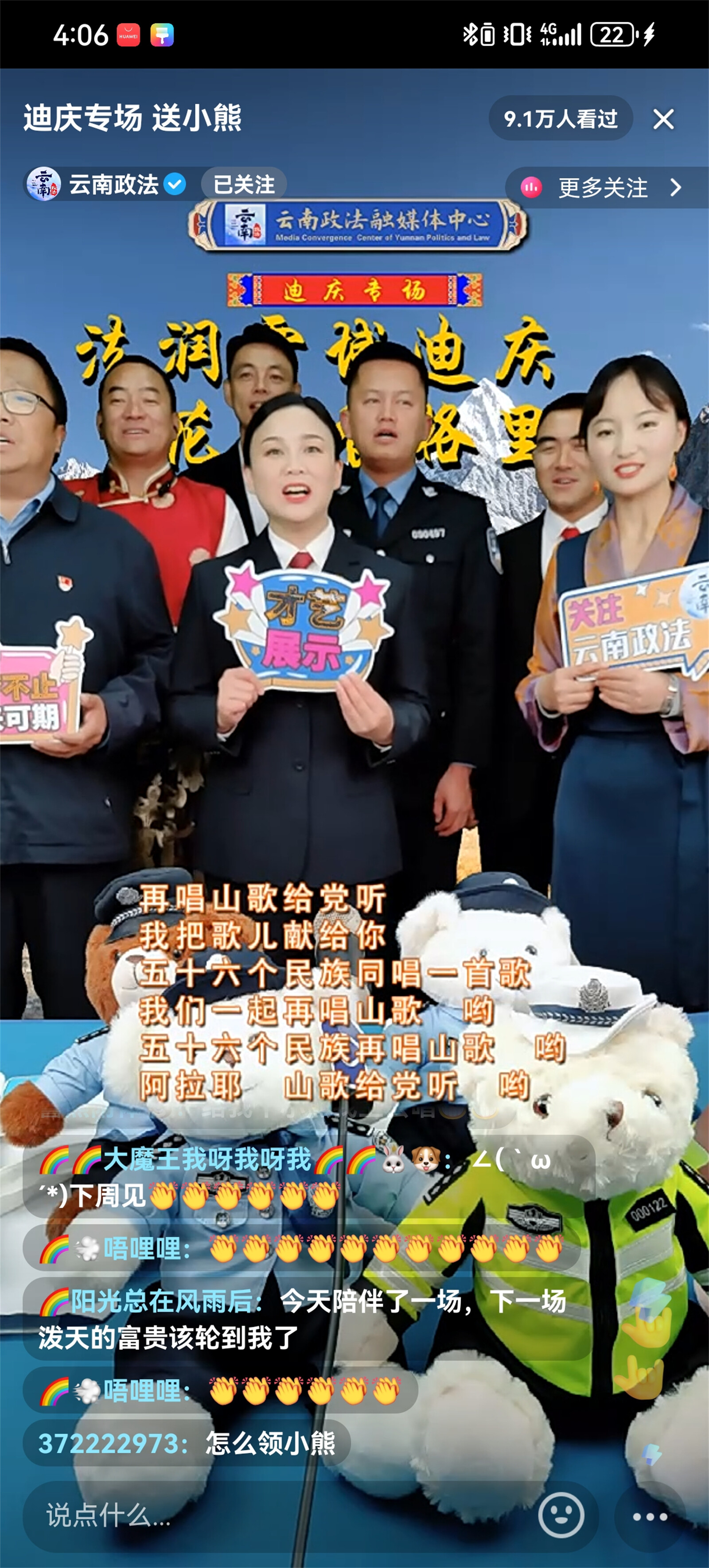 近日,迪慶州政法干警走進(jìn)云南政法普法強(qiáng)基直播間開展“法潤(rùn)雪域迪慶、花開香格里拉”迪慶州普法專場(chǎng)直播,直播聚焦群眾關(guān)切,緊密聯(lián)系時(shí)事熱點(diǎn),帶廣大網(wǎng)友體驗(yàn)了一場(chǎng)內(nèi)容豐富的普法之旅,共吸引9.1萬(wàn)人觀看,獲點(diǎn)贊超10.4萬(wàn)。