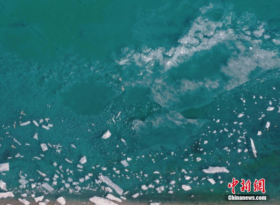 圖為航拍青海湖湖面上漂浮的冰塊如同破碎的水晶。馬銘言 攝