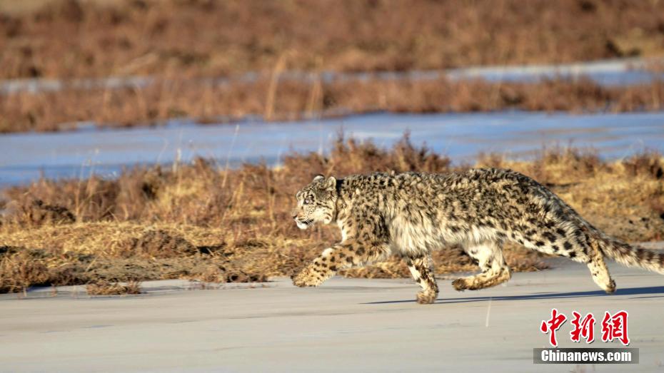 圖為雪豹在結(jié)冰的河面上行走。包雷 攝