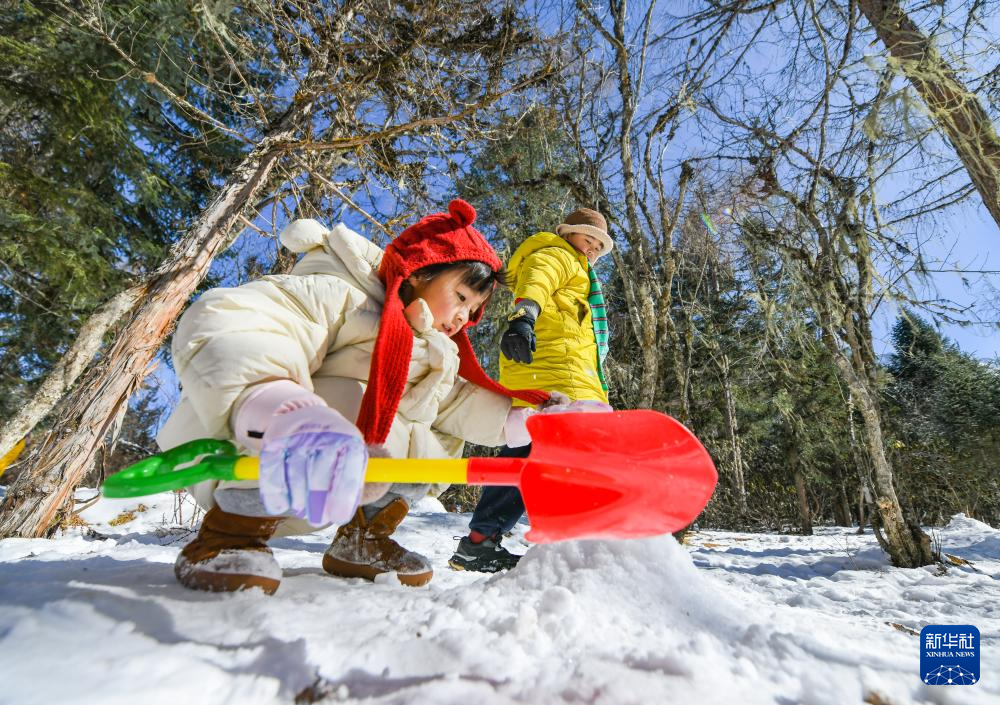 1月25日,小游客在畢棚溝風景區(qū)堆雪人。新華社記者 王曦 攝