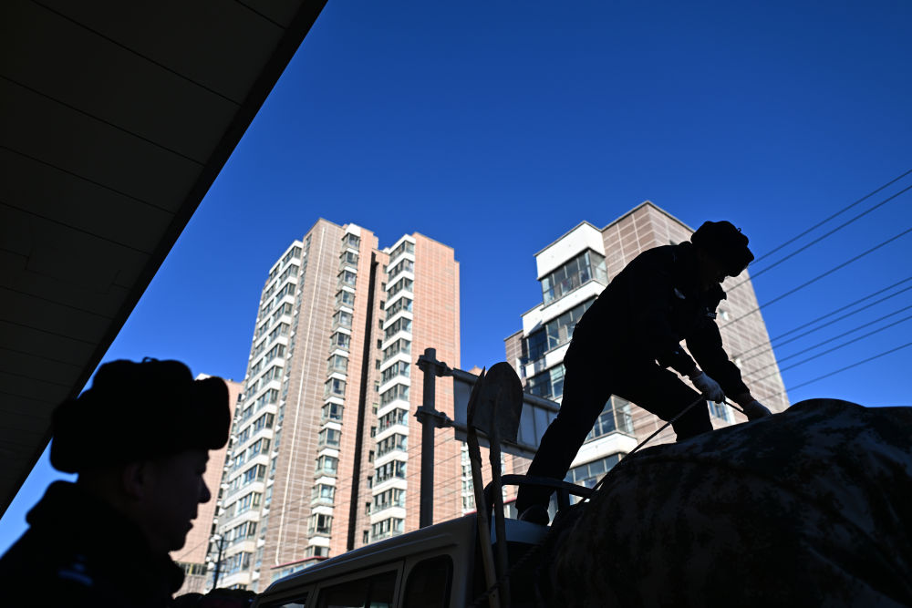 在青海省海西蒙古族藏族自治州格爾木市,可可西里森林公安局兩名巡山隊員正在裝車(1月18日攝)。新華社記者 張宏祥 攝