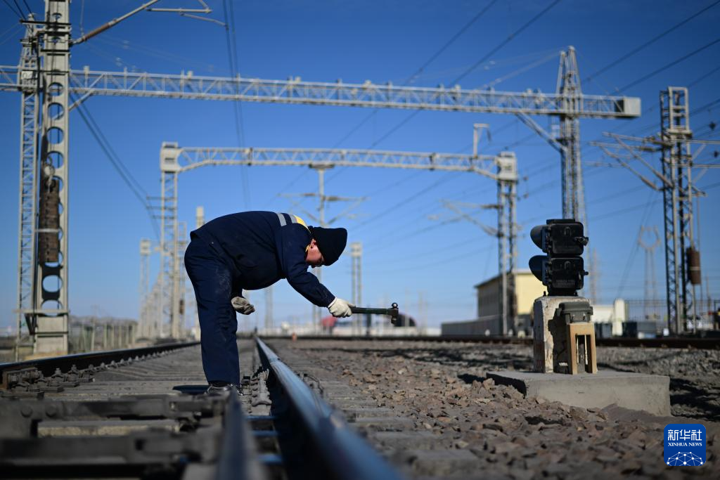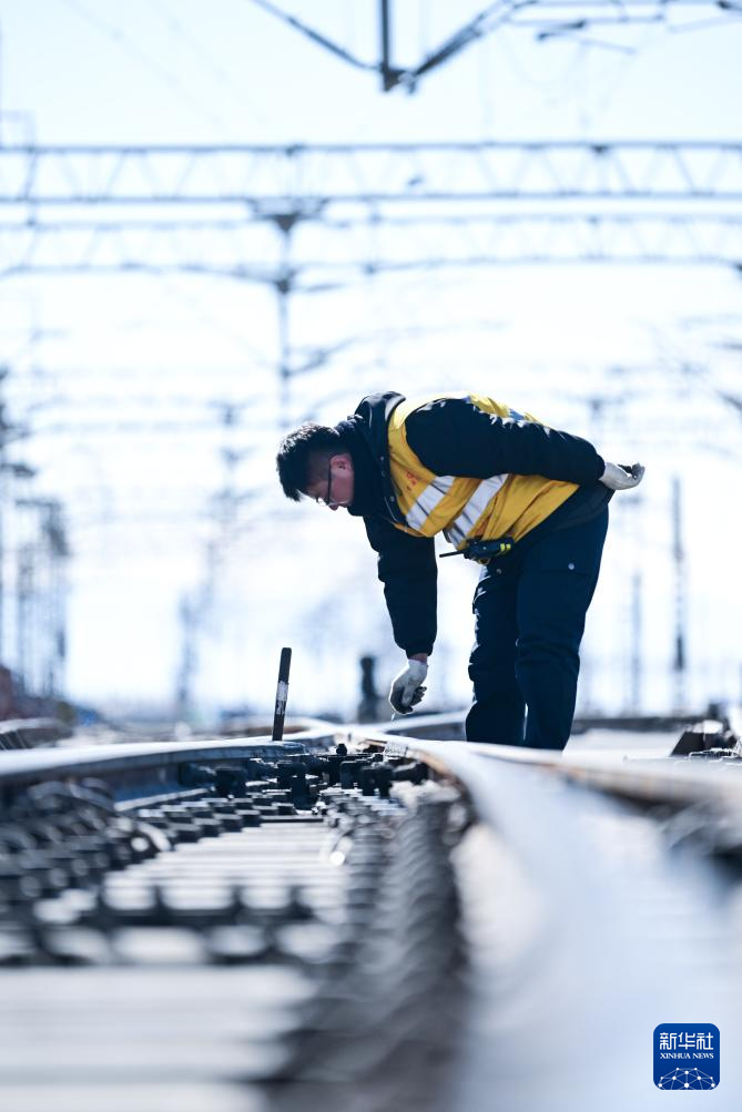 1月29日,格爾木電務(wù)段格爾木東信號(hào)車間察爾汗信號(hào)工區(qū)職工楊正宏在對(duì)察爾汗站道岔進(jìn)行檢修作業(yè)。新華社記者 張龍 攝