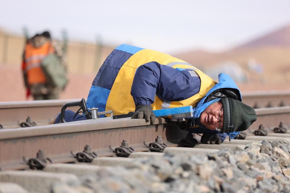 張福強(qiáng)趴在鐵軌上檢查線路情況。(中國鐵路青藏集團(tuán)有限公司格爾木工務(wù)段提供)