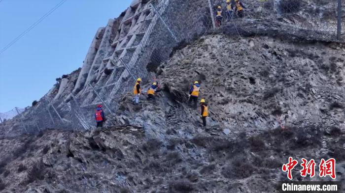 踩著積雪,沿著將近70度的陡坡攀爬一個多小時后,“攀巖小隊”終于抵達距川青鐵路垂直高度達500多米的巡查點。寒風凜冽,大家顧不上休息,抓緊掃除山上的危巖,檢查防護網(wǎng)安裝情況。這是近日發(fā)生在四川省阿壩州川青鐵路沿線的一幕。