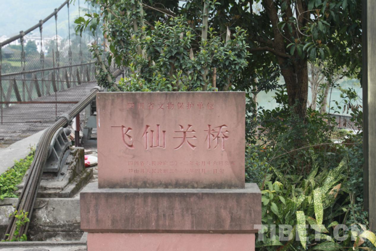 站在橋邊,遙望蜿蜒的江水就是青衣江,飛仙關(guān)橋全長(zhǎng)164米,寬4.5米,索塔為鋼筋混凝土門式框架,高29米,流動(dòng)式索鞍,策略式索錠,當(dāng)時(shí)的設(shè)計(jì)載重為15噸。橋柱橫額上有時(shí)任西南軍政委員會(huì)主席劉伯承所題寫的橋名——“飛仙關(guān)橋”。橋西岸塔柱有時(shí)任十八軍政委譚冠三題寫的檻聯(lián)——“發(fā)揮天才,發(fā)揮力量,戰(zhàn)勝困難,創(chuàng)造人民幸福,一面進(jìn)軍,一面建設(shè)解放西藏,鞏固西南國(guó)防”的字樣。東岸塔柱上有時(shí)任西康省主席廖志高題寫的檻聯(lián)——“勞動(dòng)創(chuàng)造世界飛仙天險(xiǎn)何難克服,革命帶來幸福閉塞邊區(qū)從此繁榮”字樣。橋上五顆閃閃的紅星,映照著飛仙關(guān)的繁榮,也印證著革命前輩們的美好愿景已經(jīng)變?yōu)楝F(xiàn)實(shí)。