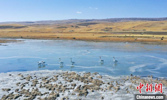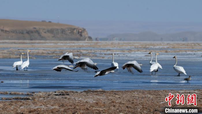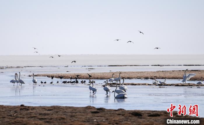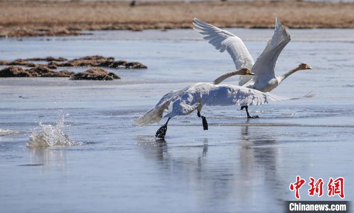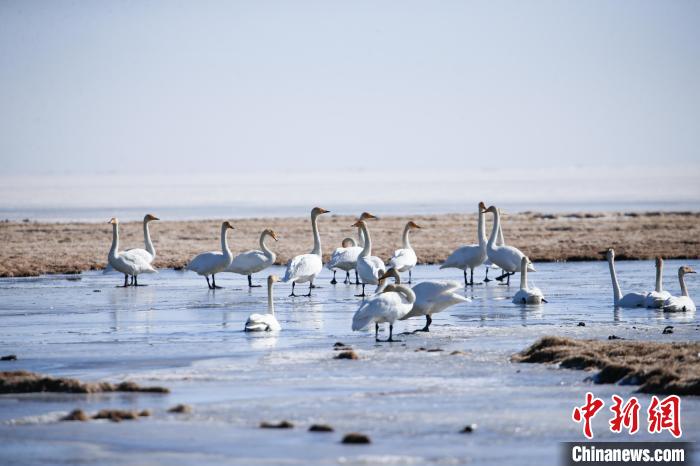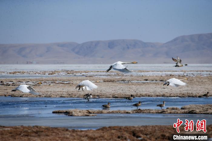 3月13日,青海省海南藏族自治州共和縣境內的青海湖泉灣濕地,大天鵝沐浴春日暖陽。隨著天氣轉暖,大天鵝、斑頭雁、赤麻鴨等水鳥聚集在青海湖泉灣濕地,時而振翅飛翔、時而戲水覓食,鳴叫聲不絕,為仍處于冰封的青海湖增添生機和活力。