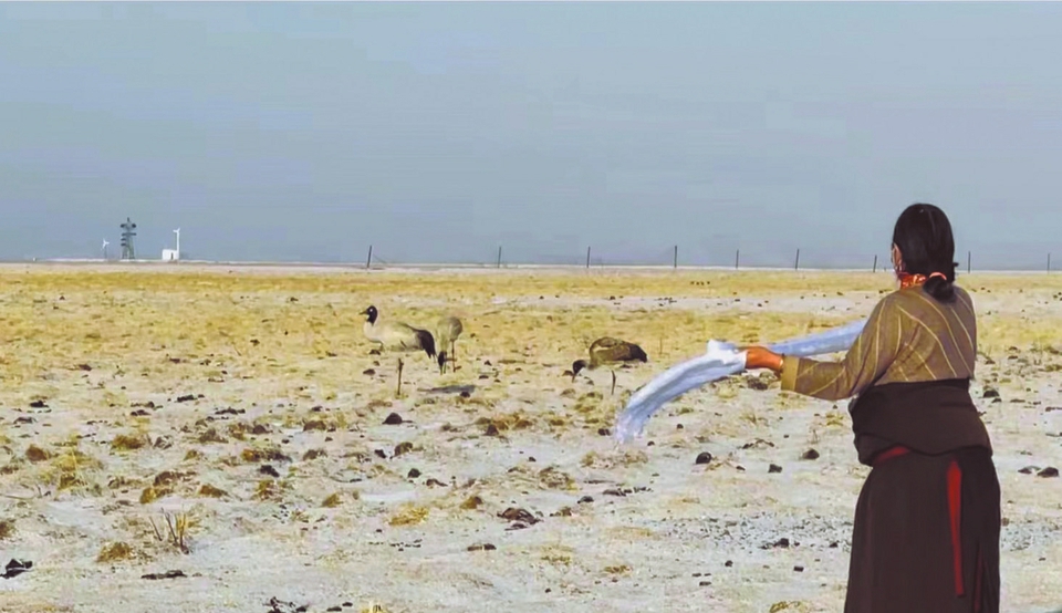 如科分享的視頻顯示,3月13日,雪后的若爾蓋銀裝素裹,獵獵的風(fēng)吹動(dòng)著如科房上的旗幟,四只黑頸鶴在黃色的草堆旁游走覓食。由他們精心照料的黑頸鶴夫婦,攜帶著兩只逐漸長(zhǎng)大的小鶴,成為今年首批回到若爾蓋濕地的種群。按照往年的慣例,如科的妻子為遠(yuǎn)道而來(lái)的“親人”送上哈達(dá)(如圖),歡迎它們回歸花湖。