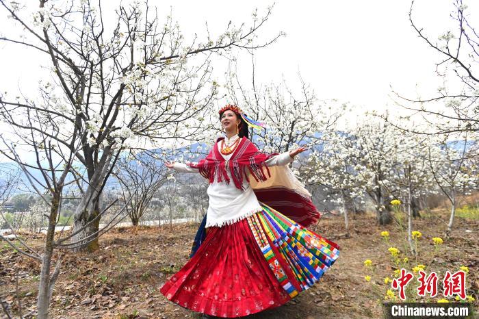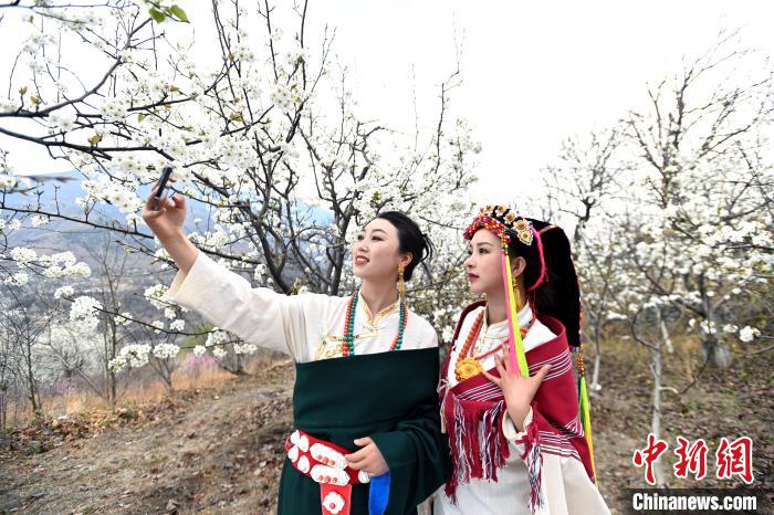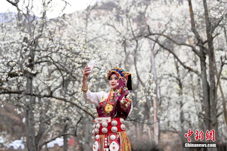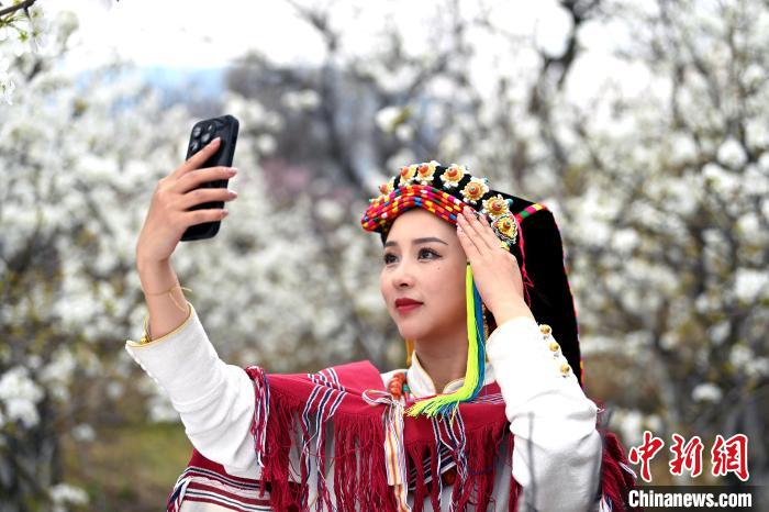 藏族姑娘在梨花林里拍照。記者 安源 攝