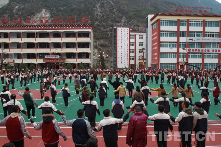 圖為學校師生們課間操跳民族鍋莊舞 攝影:登真巴珍