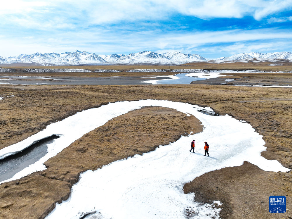 3月21日,葉金俄日(右)與東木措在青海省海北藏族自治州祁連縣的黑河流域巡護(hù)(無人機(jī)照片)。新華社記者 張龍 攝