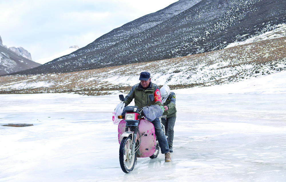 每天巡護,要沿著冰面行走時,葉抓西才郎推著摩托車,宋成芳在后面扶著,即便這樣,還會摔倒,“遇上一些小坡,只能將摩托車放倒,拴上一根繩子,慢慢滑下去,到了上坡,還是要把摩托車放倒,慢慢拉上去。”