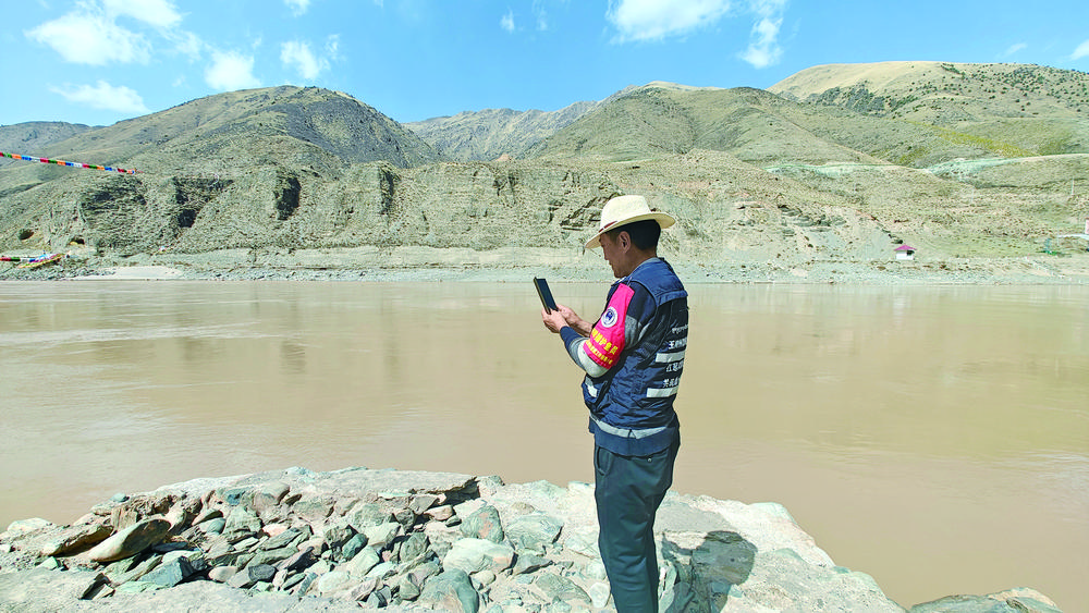4月23日下午3時(shí)左右,洛松才仁騎著摩托車行駛在通天河畔,時(shí)而停下來(lái)用手機(jī)記錄著河流、河道的情況,時(shí)而走到河邊靜靜地望著東流的河水。